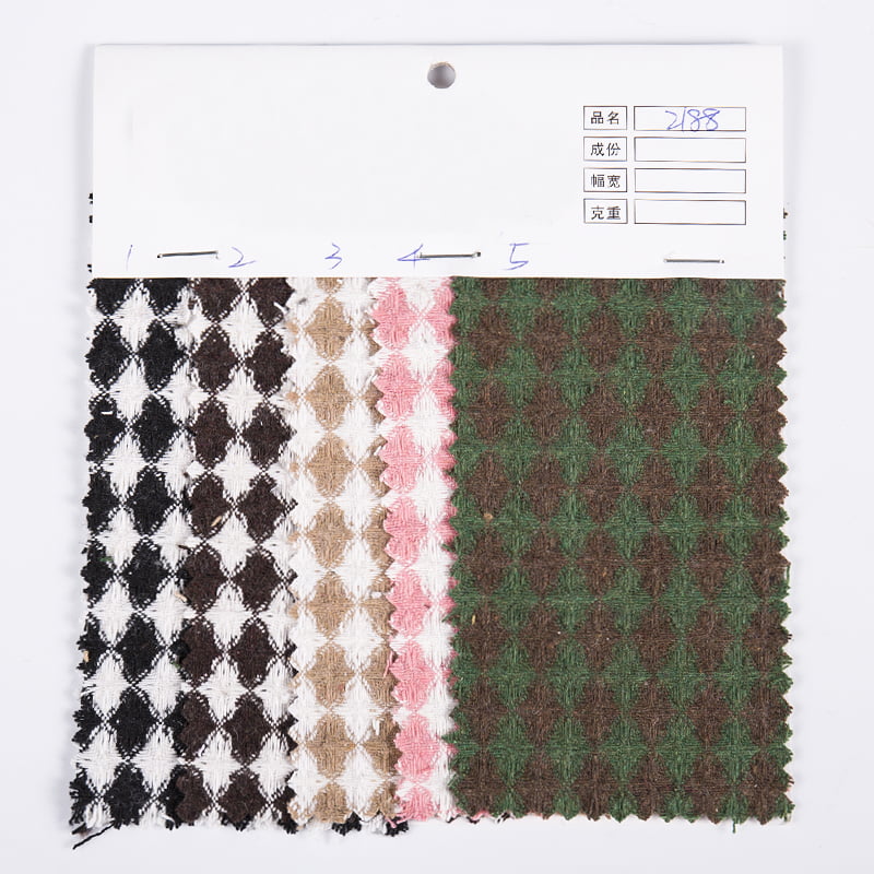 Diamond Check Jacquard Embossed Fabric 2188 je profesionalna tkanina izrađena od 100% kemijskih vlakana. Tkanina koristi jedinstveni dijamantni karo kao temeljni element dizajna. Kroz naprednu jacquard tehnologiju, ovaj klasični uzorak precizno je utkan na površinu tkanine. Svaki dijamantni čvor je pažljivo obrađen kako bi se osigurao integritet i jasnoća uzorka, pokazujući vrlo visoku razinu izrade i kontrole detalja. Što se tiče odabira materijala, tkanina 2188 koristi visokokvalitetna kemijska vlakna kako bi se osigurala izdržljivost, otpornost na gužvanje i jednostavno održavanje tkanine. Sa svojim stabilnim fizičkim i kemijskim svojstvima, kemijska vlakna daju tkanini dobru dimenzijsku stabilnost i nije ih lako deformirati ili skupiti. U isto vrijeme, otpornost na habanje i trganje kemijskih vlakana također uvelike poboljšava životni vijek tkanine, tako da može održati izvrsne performanse u različitim scenarijima primjene. Uz izvrsnu jacquard tehnologiju i visokokvalitetne materijale od kemijskih vlakana, 2188 tkanina također koristi tehnologiju utiskivanja kako bi dodatno poboljšala teksturu i vizualni učinak tkanine. Tehnologija utiskivanja izvodi poseban tretman na površini tkanine kako bi se stvorio nježan i slojevit trodimenzionalni učinak, poboljšavajući dodir i vizualni učinak tkanine. Ovaj jedinstveni reljefni dizajn ne samo da poboljšava ukupnu kvalitetu tkanine, već je čini i privlačnijom u raznim ukrasima i primjenama na odjeći.