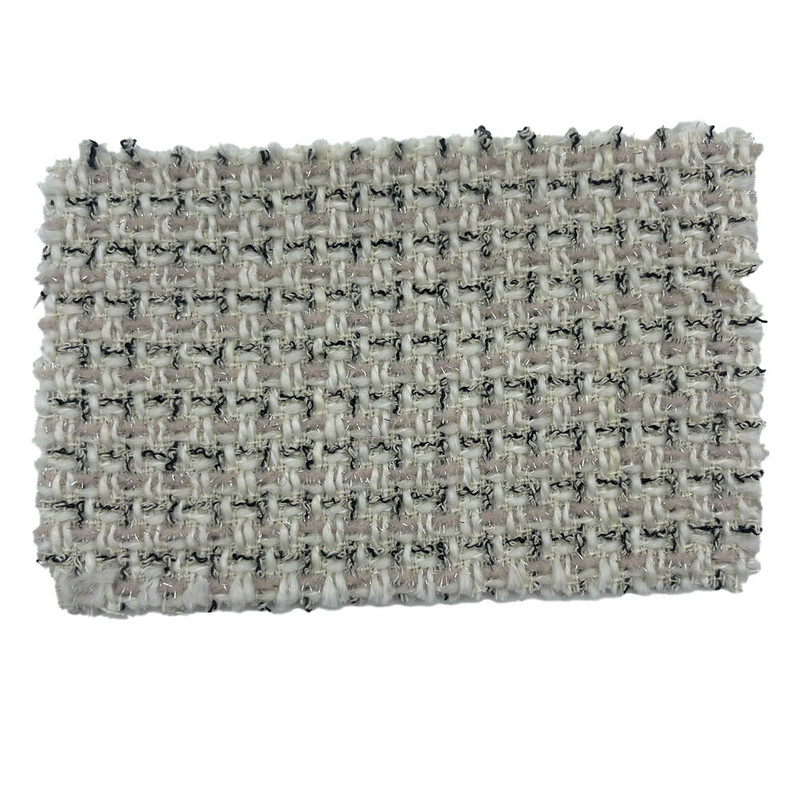Ova tkanina, označena kao artikl 23523, je tkanina od tvida koja se sastoji od 78% poliestera, 12% vune i 10% pamuka. S masom po jedinici površine od 440 g/m2, predstavlja konstrukciju srednje težine prikladnu za haljine. Svijetloružičasta baza ima karirani uzorak integriran s metalik pređom tijekom procesa tkanja. Ova kombinacija stvara kontrast u vizualnom izgledu i refleksiji svjetla. Mješavina poliestera, vune i pamuka doprinosi dimenzijskoj stabilnosti tkanine, toplinskoj regulaciji i upravljanju vlagom. Ove tehničke karakteristike čine ovaj tvid primjenjivim za modne haljine gdje je potrebna definicija uzorka i izvedba materijala.