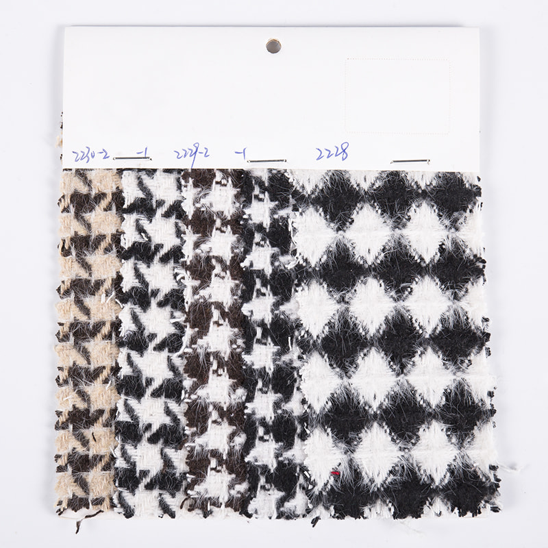 Izrazita značajka tkanine od tvida s dijamantnom zubnom zubicom za dugu kosu 2230/2229/2228 je jedinstvena tehnologija obrade duge kose, koja kombinira klasični dijamantni oblik i uzorak zubne zubice kako bi se stvorio patchwork i slojeviti vizualni efekt. Ovaj inovativni dizajn ne samo da daje tkanini visok stupanj prepoznatljivosti, već je i ističe među mnogim sličnim proizvodima. Iz perspektive sastava materijala, tkanina je izrađena od 100% sirovina od kemijskih vlakana, što osigurava izvrsna fizička svojstva i kemijsku stabilnost. Materijal od kemijskih vlakana, sa svojom dobrom otpornošću na trošenje, otpornošću na gužvanje i lakim održavanjem, omogućuje ovoj tkanini da zadrži svoj svjež oblik i svijetlu boju tijekom dugotrajne upotrebe. Istodobno, higroskopnost, prozračnost i drugi pokazatelji kemijskih vlakana također su strogo kontrolirani kako bi se osiguralo ugodno iskustvo nošenja. Vještina izrade dugačkog vunenog tvida s dijamantnim zubima također je pohvalna. Korištenje napredne tekstilne tehnologije i opreme omogućuje tkanini da zadrži grubu teksturu, a istovremeno ima nježan dodir. Pređe osnove i potke međusobno su čvrsto i ravnomjerno isprepletene, čime se osigurava čvrstoća i stabilnost tkanine. Što se tiče područja primjene, tkanina od tvida duge kose s dijamantnim houndstooth naširoko se koristi u haute couture modi, elegantnim odijelima i raznim ukrasnim tkaninama zbog svog jedinstvenog dizajna i izvrsnih performansi.