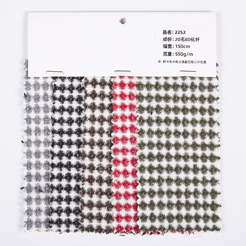 Mala karirana vunena tkanina od tvida s dijamantnom četkom za kapute 2252 je mješovita tkanina posebno dizajnirana za vrhunske kapute, koja kombinira bit klasičnog dizajna s modernim umijećem izrade. Ova tkanina je precizna mješavina 20% visokokvalitetne vune i 80% visokoučinkovitih kemijskih vlakana, dizajnirana da pruži iskustvo nošenja koje je i moderno i praktično. Kao prirodno vlakno, vuna je poznata po izvrsnom zadržavanju topline, prozračnosti i upijanju vlage. U ovoj tkanini dodatak vune ne samo da daje mek i nježan dodir, već također pojačava prirodni sjaj i toplu teksturu tkanine. U isto vrijeme, prirodna svojstva vune pomažu regulirati tjelesnu temperaturu, tako da kaput i dalje može zadržati ugodno i toplo iskustvo nošenja u hladnim godišnjim dobima. Komponenta kemijskih vlakana dodaje veću praktičnu vrijednost ovoj tkanini sa svojom izvrsnom otpornošću na gužvanje, otpornošću na habanje i lakoćom održavanja. Kroz naprednu tehnologiju miješanja, kemijska vlakna i vuna su usko spojeni, što ne samo da poboljšava ukupnu čvrstoću i stabilnost tkanine, već također olakšava čišćenje i održavanje, produžujući vijek trajanja kaputa. Mali dijamantni brušeni karirani uzorak vrhunac je dizajna tkanine. Sa svojim jednostavnim i elegantnim značajkama i glatkim linijama, pokazuje skromnu i elegantnu ljepotu. Ovaj uzorak predstavlja delikatan osjećaj slojevitosti na tkanini, čineći kaput trodimenzionalnijim i vizualno punijim. U isto vrijeme, mali dijamantni brušeni karirani uzorak također ima određeni efekt vizualnog proširenja, što pomaže u modificiranju oblika tijela i poboljšavanju cjelokupnog temperamenta nositelja.