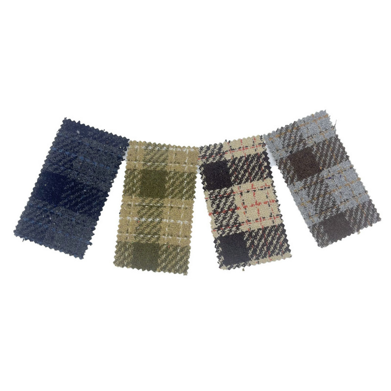 Ova tkanina, označena kao artikl 4144, je jacquard tkanina od tvida koja se sastoji od 10% vune i 90% drugih vlakana. S masom po jedinici površine od 550 g/m, predstavlja tešku konstrukciju. Zelena površina kombinira osnovu od keper tkanja s prugastim kariranim uzorcima, stvorenim kroz jacquard proces koji integrira linearne trake s mrežastim formacijama. Ova tehnika proizvodi isprepletene uzorke preko karakteristične dijagonalne teksture kepera. Sastav mješavine vune doprinosi dimenzijskoj stabilnosti i trajnosti tkanine. Ove tehničke karakteristike rezultiraju materijalom s višeslojnim uzorkom i strukturnom gustoćom, što ga čini primjenjivim za odjevne predmete gdje su potrebni složeni elementi dizajna i otpornost tkanine.
